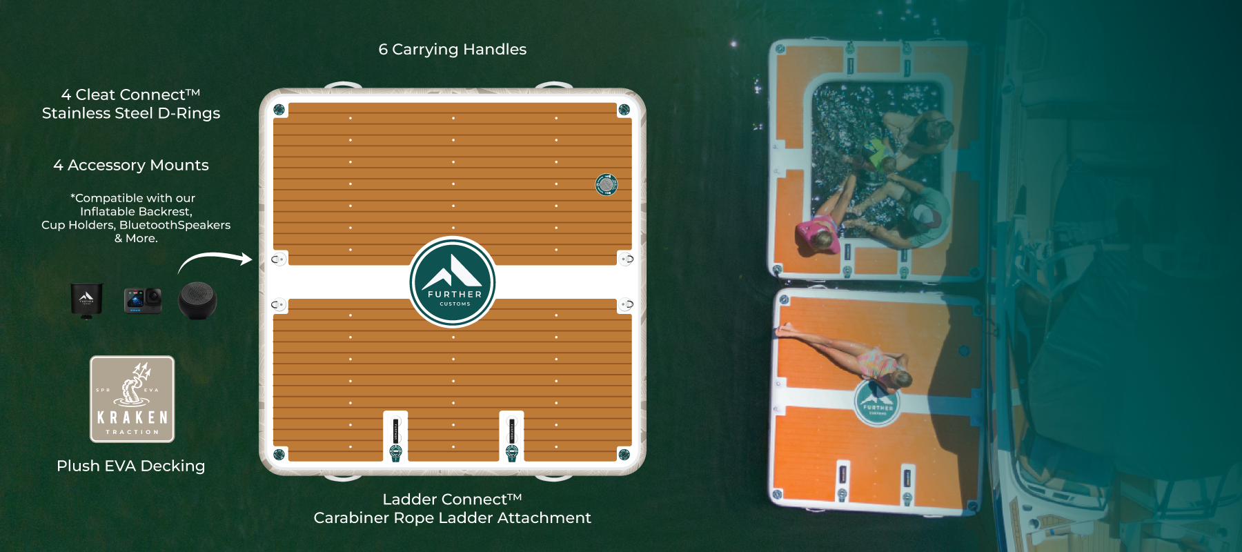 Crafted to elevate your time on the water with features that outshine ordinary platforms. Its 8-inch thickness ensures exceptional stability, while the plush EVA traction pad adds comfort and grip while keeping the surface cool. With rugged reinforced construction, accessory mounts, and an optional backrest, it delivers durability, versatility, and a more comfortable way to relax, lounge, or tie up on the water.