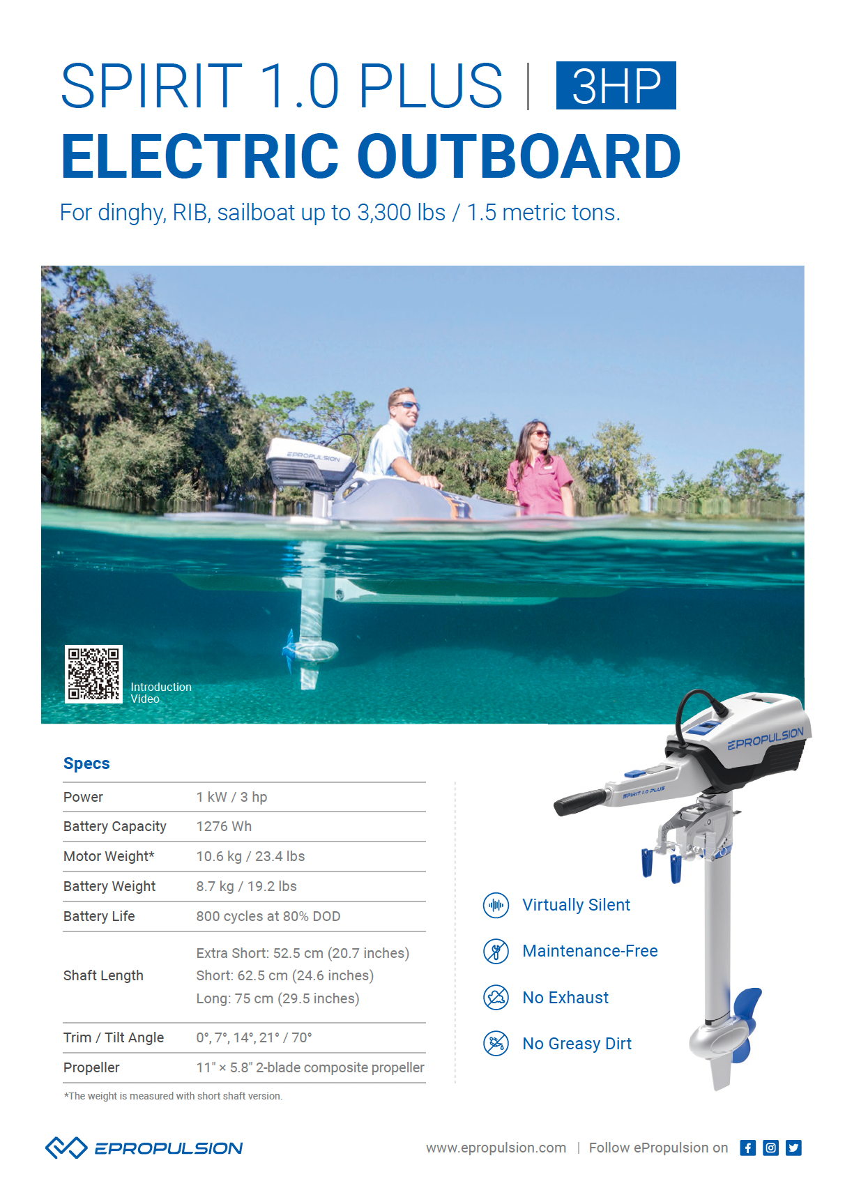 ePropulsion provides a 5-year warranty on the Spirit. Must complete the online product registration WITHIN 30 DAYS from the date of purchase and have a confirmation email is sent to you. The warranty begins on your invoice date.